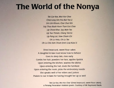 Saya tertarik dengan sebuah puisi berjudul The World Of The Nyonya yang terdapat di weddings gallery Museum Peranakan. Puisi tersebut sangat populer di kalangan orang-orang Peranakan zaman dahulu. The World Of The Nyonya mencerminkan tuntutan mengenai standar ideal seorang wanita Peranakan. Sebagai seorang istri atau menantu yang baik, wanita Peranakan diharapkan dapat berdandan dengan cantik, memiliki kecakapan memasak, sigap membersihkan rumah, hingga menjahit. Tak jauh berbeda dengan wanita Indonesia pada zaman dahulu ternyata. Jika Indonesia memiliki RA Kartini, Singapura memiliki Tan Teck Neo. Ia merintis sebuah sekolah bagi para wanita di Singapura agar mereka bisa mendapatkan pendidikan yang sempurna. Tan Teck Neo juga dikenal sebagai salah satu penggagas dan presiden pertama Persatuan Wanita China di Singapura.